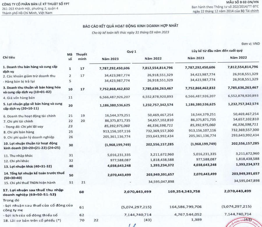 Một đơn vị bán lẻ lớn khác là Công ty cổ phần Bán lẻ Kỹ thuật số FPT (FPT Retail, mã ck: FRT) cũng ghi nhận kết quả kinh doanh quý I/2023 với kết quả lợi nhuận sau thuế hợp nhất đạt 2 tỷ đồng, giảm 99% so với mức lãi 169 tỷ đồng quý I/2022.