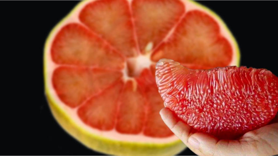 Nặng khoảng 1,5 kg, bưởi Ruby có phần ruột đỏ và mọng nước hơn so với những giống bưởi thông thường. Vị của loại quả bưởi này cũng khá đặc biệt, ngọt và phần tép rất mềm.