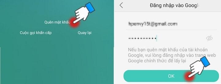 Bấm chọn "Quên mật khẩu ở màn hình mở khóa". (Dòng chữ Quên mật khẩu sẽ hiện ra khi bạn bấm sai mật khẩu nhiều lần). Lúc này, máy sẽ hiển thị ra phần điền thông tin tài khoản Google. Bạn chỉ cần điền đầy đủ thông tin đăng nhập, pass tài khoản Google chính xác của mình tại đây. Sau đó, ấn chọn OK.