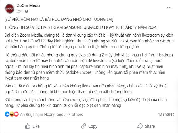 Cần phải hiểu rằng trong câu chuyện này, lỗi không thuộc về phía Samsung. Khi nhãn hàng thực hiện livestream trên các nền tảng, thông thường sẽ có một đơn vị bên thứ 3 nhận xử lý đầu việc này. Trong trường hợp sự cố xảy ra vào ngày 10/7, đó là ZoOm Media, một đơn vị cung cấp thiết bị - kỹ thuật vận hành livestream tại Việt Nam. Đơn vị này ngay sau đó cũng có lời giải thích và xin lỗi nhãn hàng được đăng tải trên trang Facebook riêng.