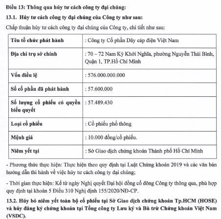 Một trong những điểm đáng chú ý trong tài liệu họp Đại hội đồng cổ đông thường niên năm 2024 là việc Công ty cổ phần Dây cáp điện Việt Nam có tờ trình Đại hội cổ đông thông qua việc hủy tư cách công ty đại chúng của công ty. Đồng thời, Công ty có tờ trình hủy bỏ niêm yết toàn bộ hơn 57 triệu cổ phiếu đang niêm yết tại HOSE và hủy đăng ký chứng khoán tại Tổng công ty Lưu ký và Bù trừ Chứng khoán Việt Nam (VSDC).