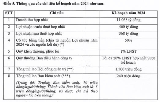 Trong bộ tài liệu vừa công bố, Cadivi có tờ trình Đại hội cổ đông thông qua chỉ tiêu kế hoạch năm 2024. Cụ thể, doanh thu thuần hợp nhất của CAV dự kiến đạt 11.068 tỷ đồng, tăng trưởng 10% so với thực hiện năm 2023. Lợi nhuận trước thuế đạt 460 tỷ đồng, giảm 13% so với thực hiện năm ngoái.