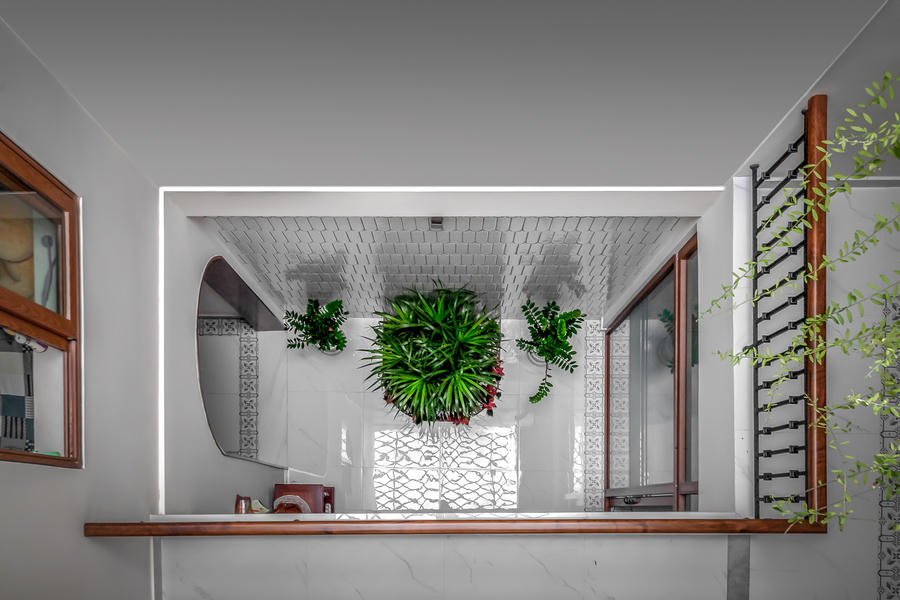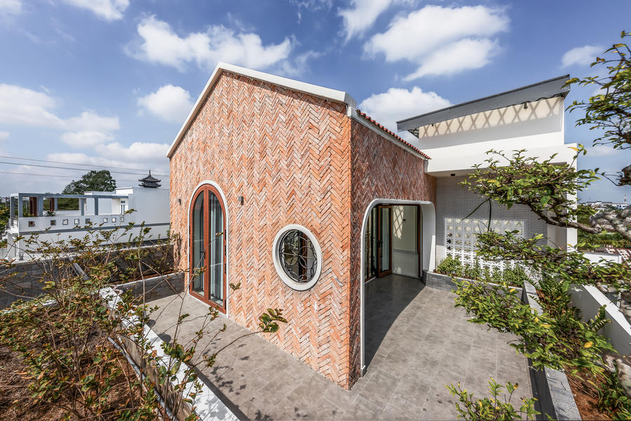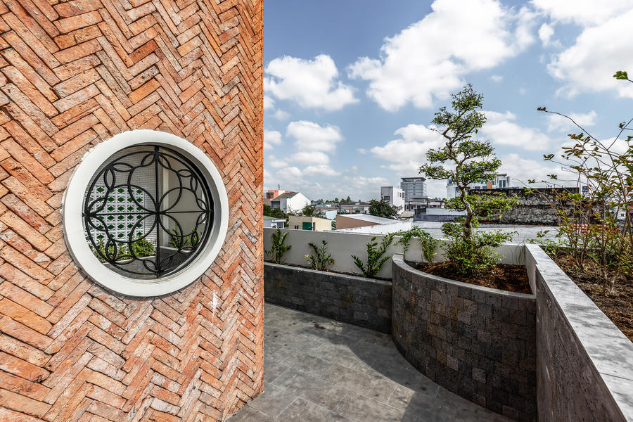 Cầu thang thừa được thay thế bằng giếng trời lớn đủ để ánh sáng tự nhiên khuếch tán vào mọi ngóc ngách trong nhà và cây cối bên trong vẫn có thể phát triển tự nhiên. Các ô thoáng được bố trí ở những vị trí phù hợp để đón ánh sáng, thông gió tự nhiên nhưng vẫn giữ được sự riêng tư cho gia chủ và giúp ngôi nhà tự “thở”. Những viên gạch nung cũ được tái sử dụng mang lại giá trị truyền thống sống lại và màu gạch đỏ cùng họa tiết gạch ngoằn ngoèo giúp ngôi nhà được nhận diện từ xa và tạo nên nét cá tính rất riêng cho ngôi nhà. Mặt tiền mới là sự kết hợp hoàn hảo giữa hiện đại và truyền thống. Mái đầu hồi và vòm cong gợi lên những ký ức quen thuộc về những ngôi nhà cổ mà vẫn giữ được nét hài hòa với không gian xung quanh.