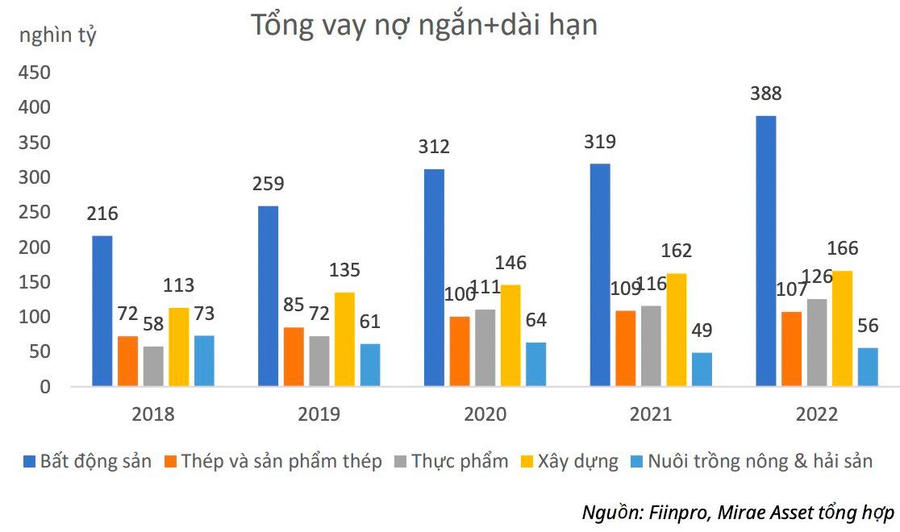 Dựa theo số liệu chốt năm 2022, có 5 ngành đang có mức vay nợ cao và dự báo sẽ hưởng lợi trong ngắn hạn trước quyết định giảm lãi suất này: Bất động sản, Thép, Thực phẩm, Nuôi trồng nông & hải sản và Xây dựng.