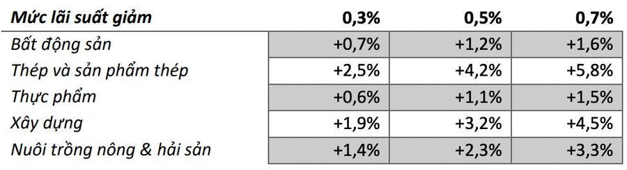 Theo MAS, với kịch bản trung tính nhất, ở mức giảm lãi suất cho vay xuống 0,5%, sẽ giúp cho ngành Thép có phần cải thiện tăng lợi nhuận trước thuế lớn nhất ở mức 4,2%, và nhóm thực phẩm có mức biến động thấp nhất với 1,1%.