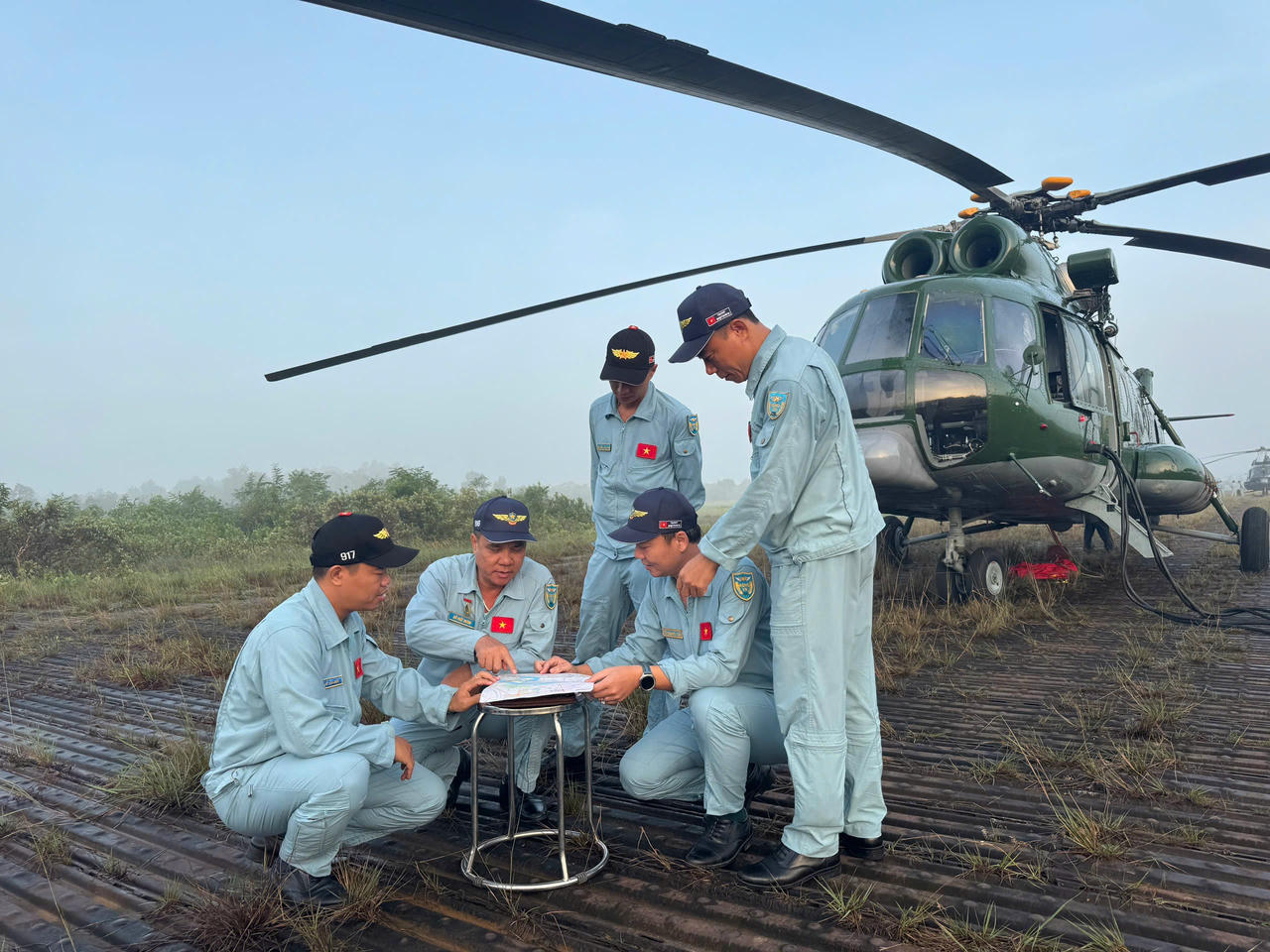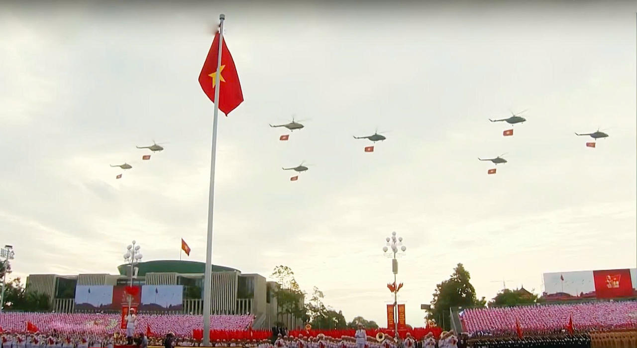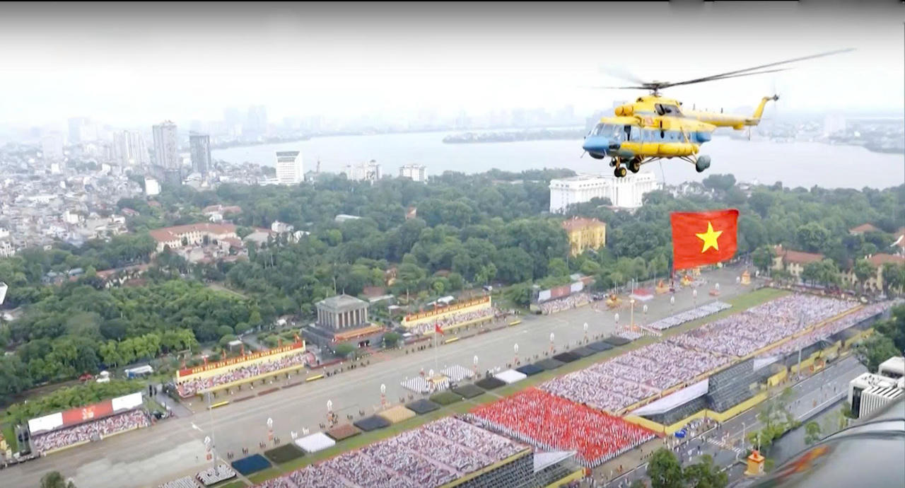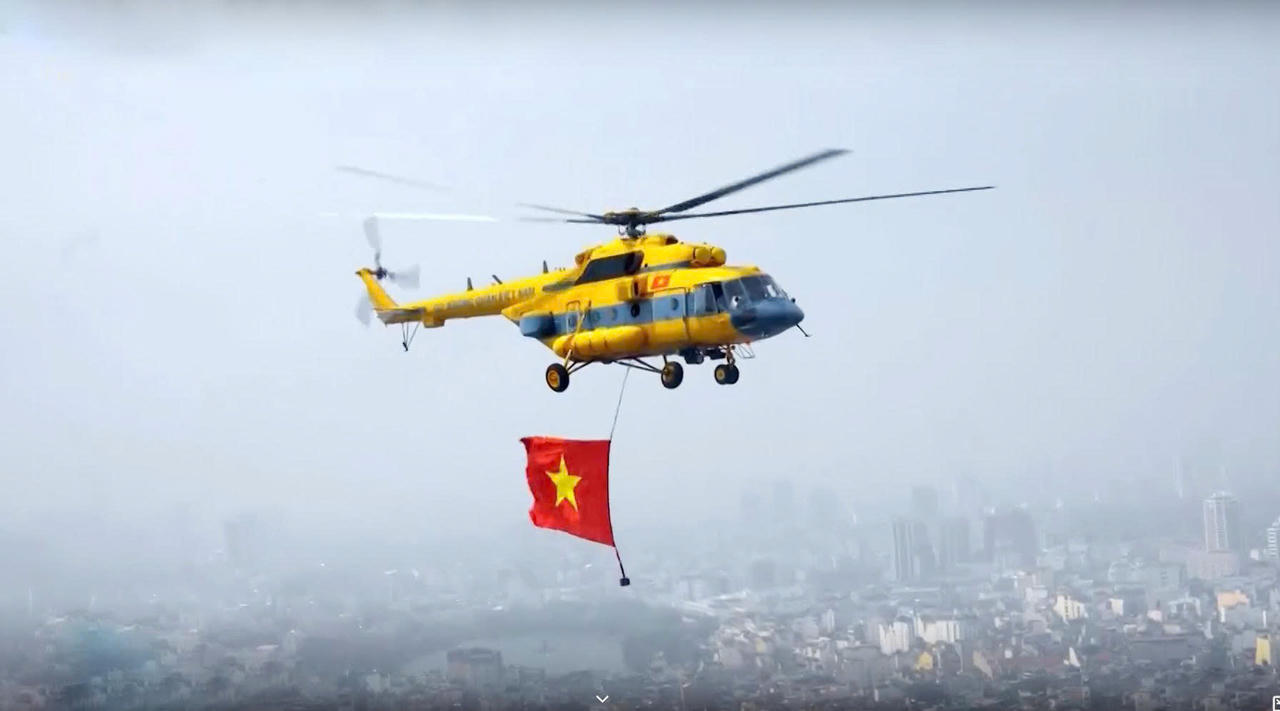 Xuất phát từ sân bay Hòa Lạc (Hà Nội) đúng 6h40, biên đội trực thăng bao gồm Mi-171, Mi-17, Mi-8 bay theo đội hình 10 chiếc mang cờ Đảng, cờ Tổ quốc theo hướng Hồ Tây tiến vào Quảng trường Ba Đình, Hà Nội.