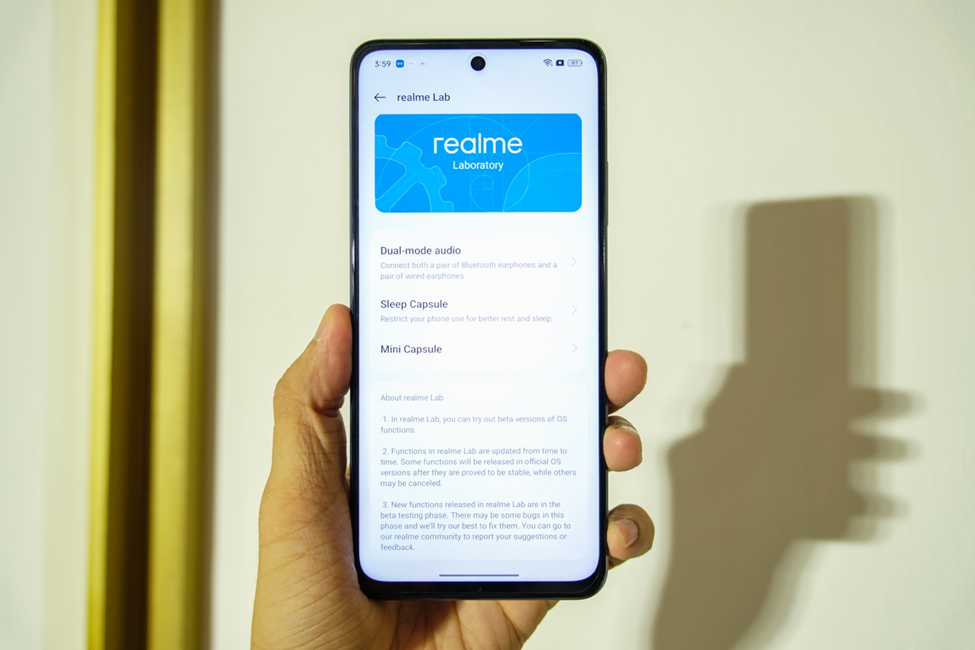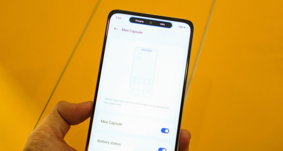 Máy có độ mỏng 7.89mm đem lại cảm giác cầm khá thoải mái dẫu cho màn hình không hề nhỏ, lên tới 6.72 inch, IPS LCD, Full HD+, tần số quét 90Hz, chỉ phần cằm là hơi dày, nói chung cũng khá bảnh bao trong phân khúc. Nhưng thứ thực sự gây chú ý của màn hình này đó là tính năng Mini Capsule tương tự Dynamic Island của iPhone 14 Pro. Phần hiển thị này bao gồm cả nốt ruồi sẽ hiển thị nhanh thông báo sạc, đếm bước chân, … với nhiều màu khác nhau và tương lai còn được cập nhật nhiều tác vụ hơn nữa. Ý tưởng này khá hay cho dù nhiều người nói copy iPhone nhưng việc các hãng học hỏi nhau điểm tốt phần lợi sẽ thuộc về người dùng.