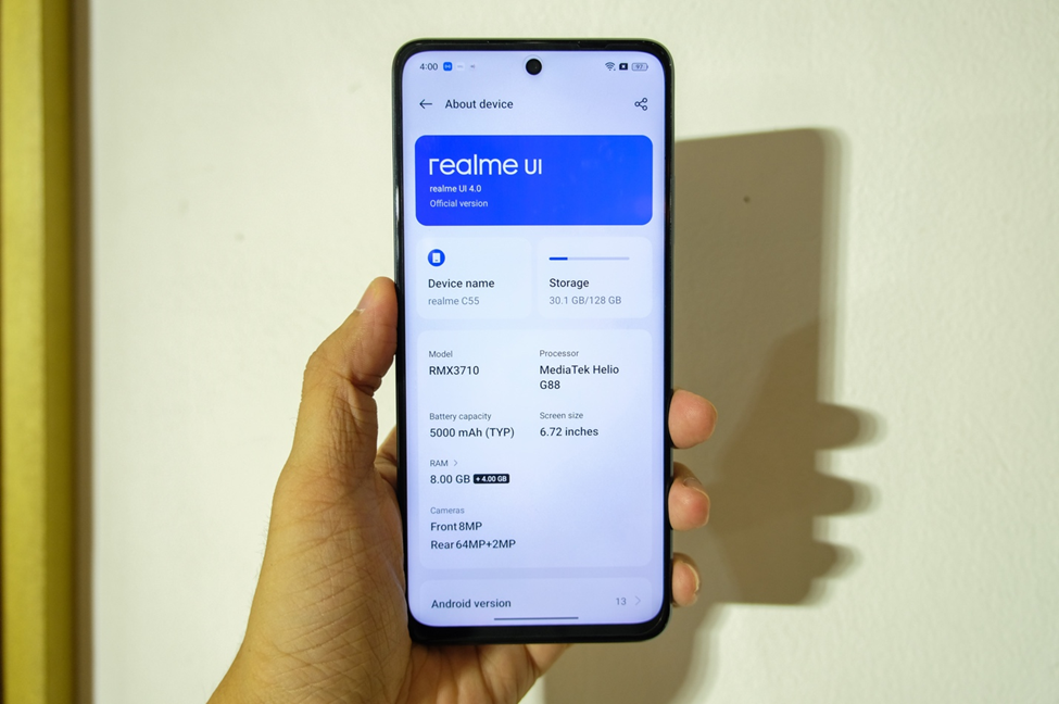 realme C55 sử dụng con chip MediaTek Helio G88, hiệu năng ổn trong phân khúc để chơi những game phổ biến hiện nay. Đi kèm là RAM 6/8GB + bộ nhớ trong 128/256GB, pin 5.000mAh hỗ trợ sạc nhanh 33W, cho phép sạc được 50% pin chỉ trong 29 phút cắm sạc.
