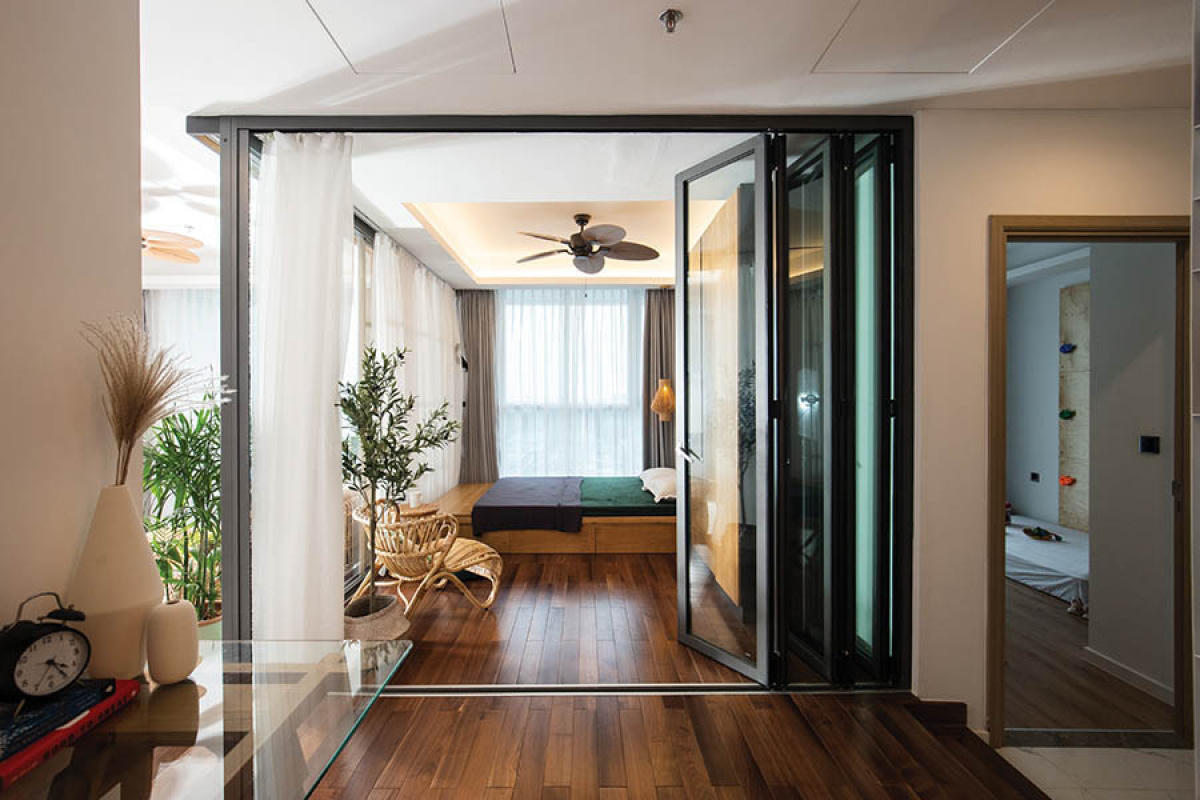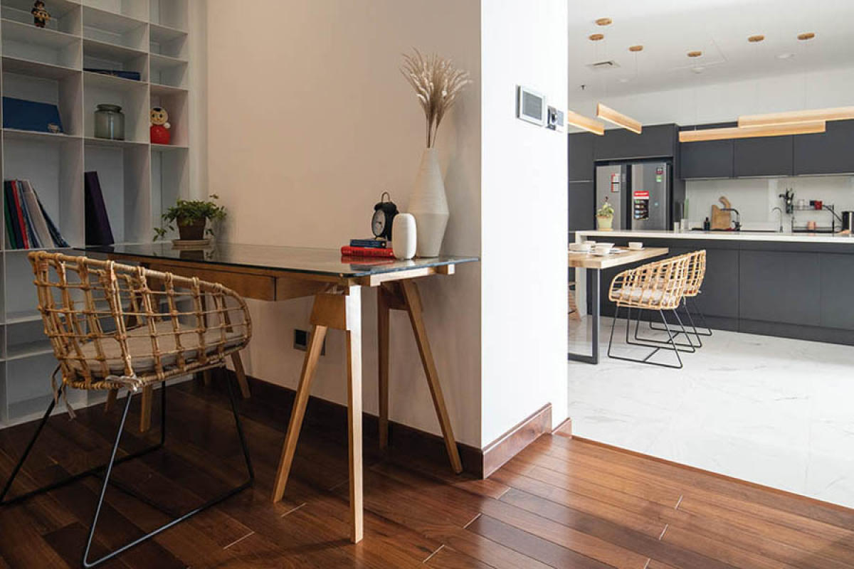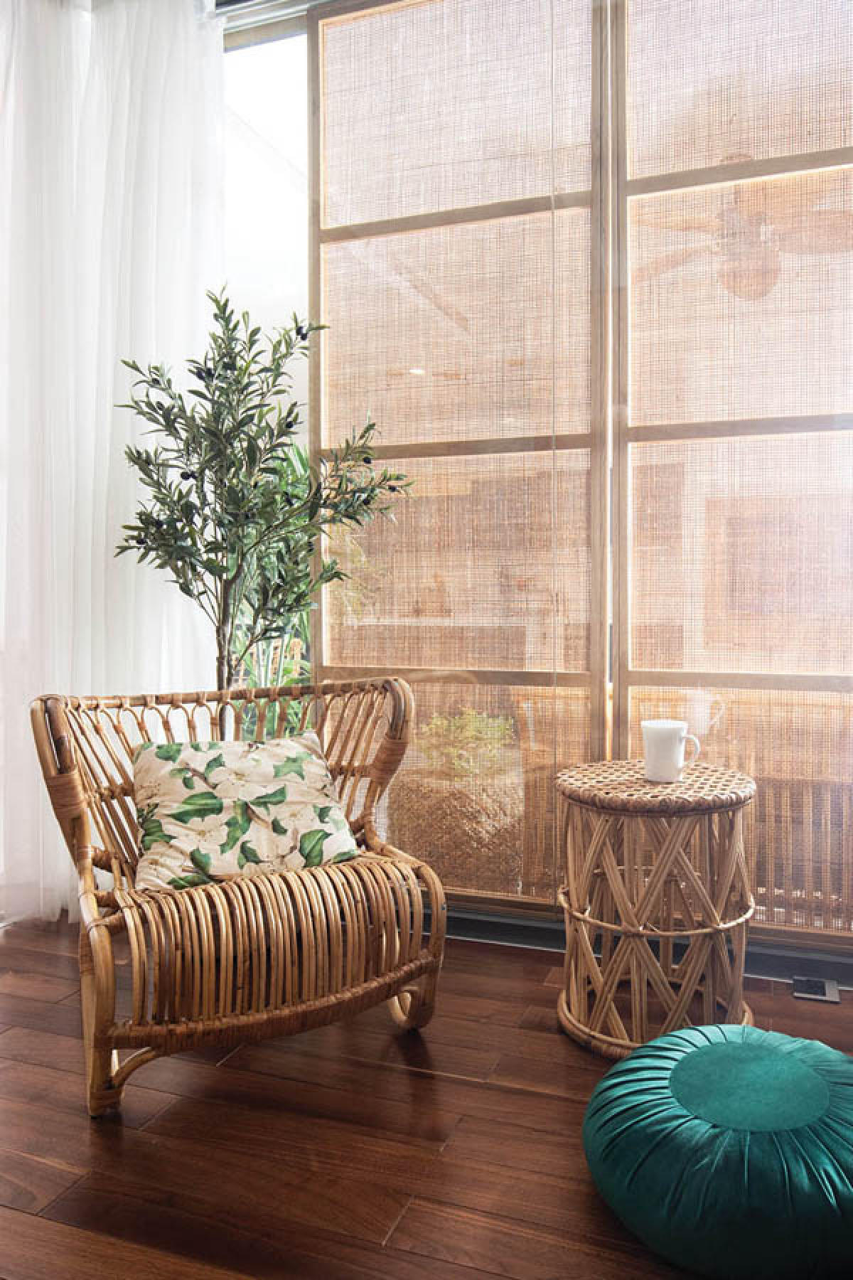 Một căn hộ hiện đại nhưng lại gây ấn tượng bởi vật liệu nội thất từ mây tre truyền thống, tạo nên nét riêng biệt mà vẫn đầy thẩm mỹ.
