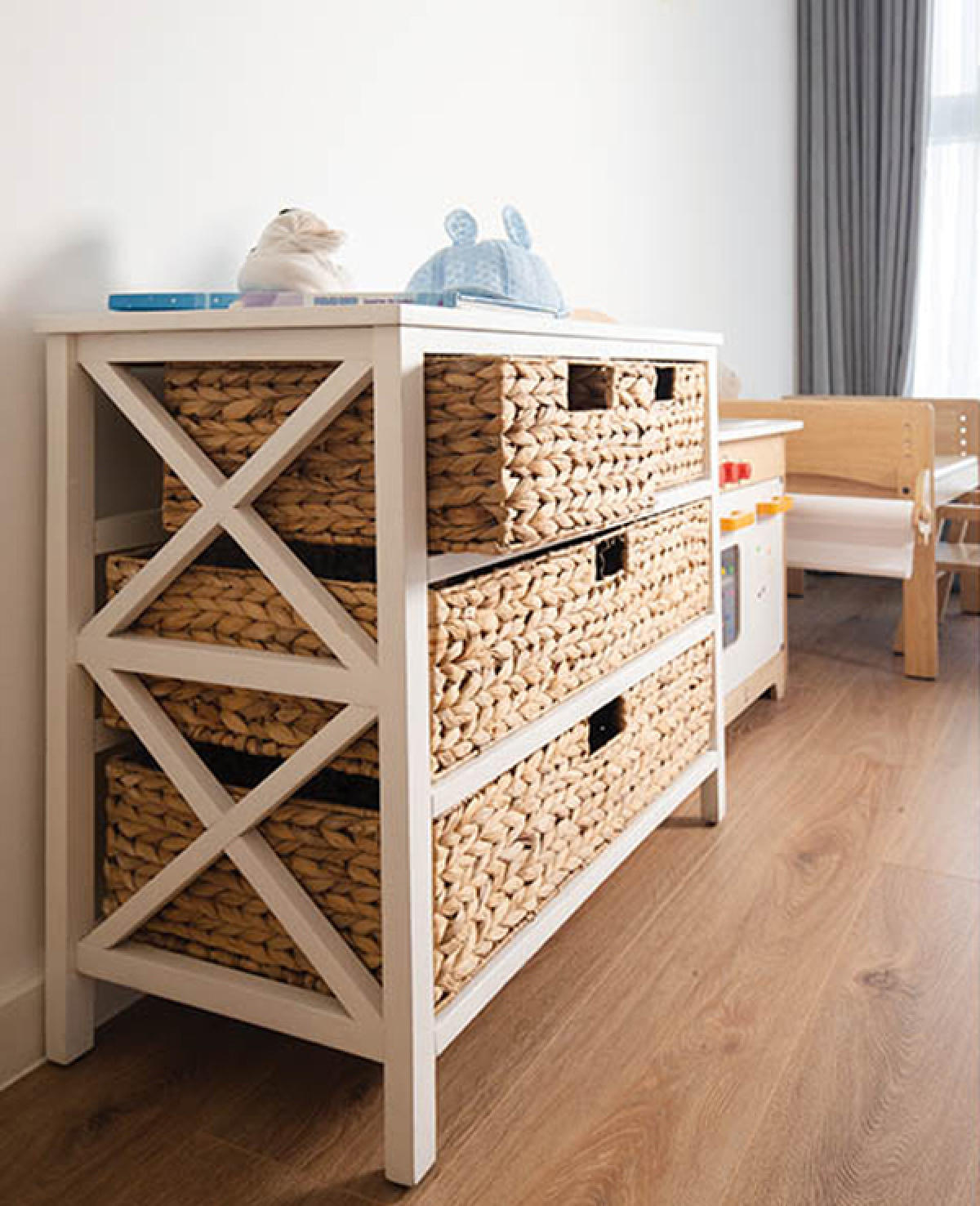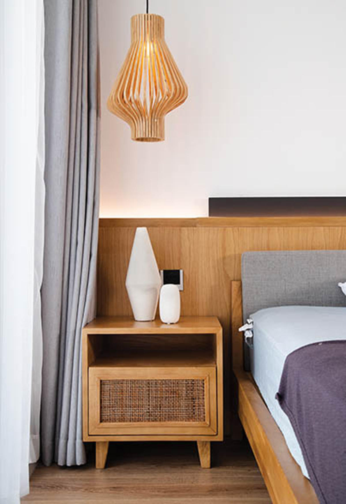 Tủ đầu giường trong phòng ngủ được thiết kế kết hợp gỗ và mây - tre.