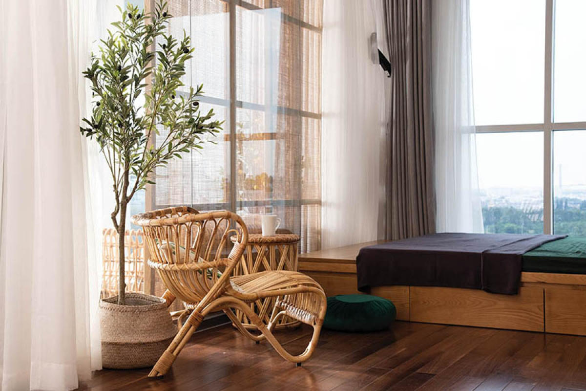 Từ mong muốn đó, kiến trúc sư đã đưa ra ý tưởng dùng đồ nội thất từ mây tre và các chế phẩm từ thực vật, cây cối. Điểm nhấn đầu tiên là bộ bàn ghế ở phòng khách được làm từ chất liệu mây – tre; chiếc đôn cũng cùng chất liệu. Tấm thảm sàn được làm bằng cói và vách cửa phía sau ngăn với phòng ngủ là chất liệu vải bố từ cây đay.