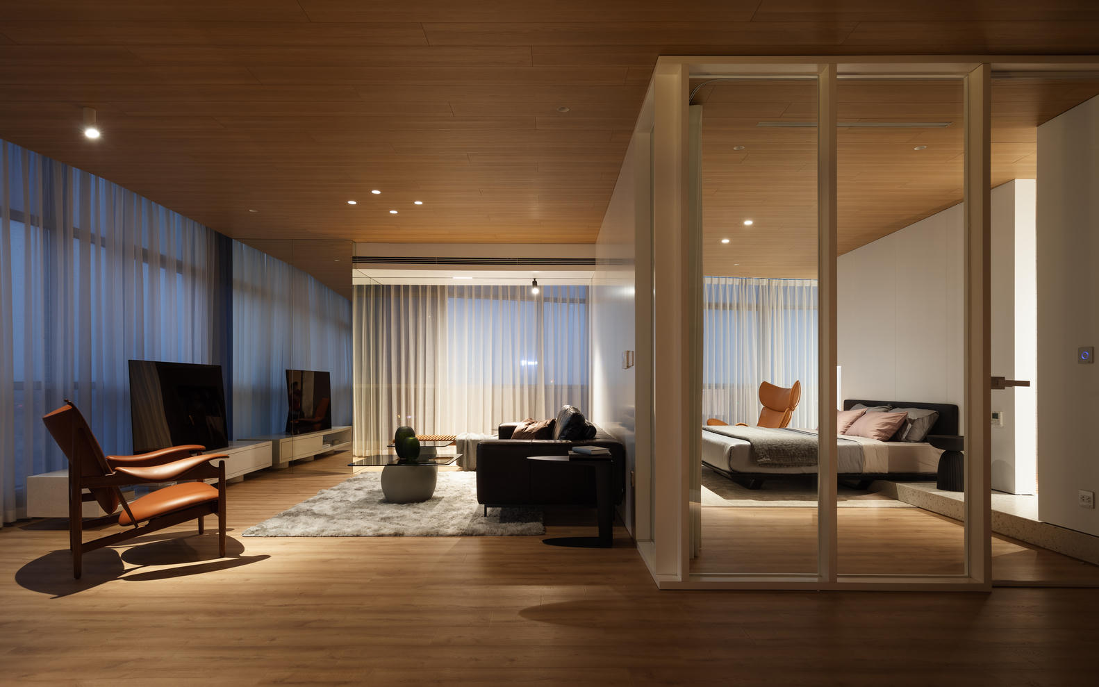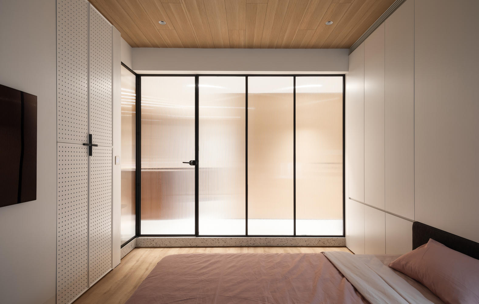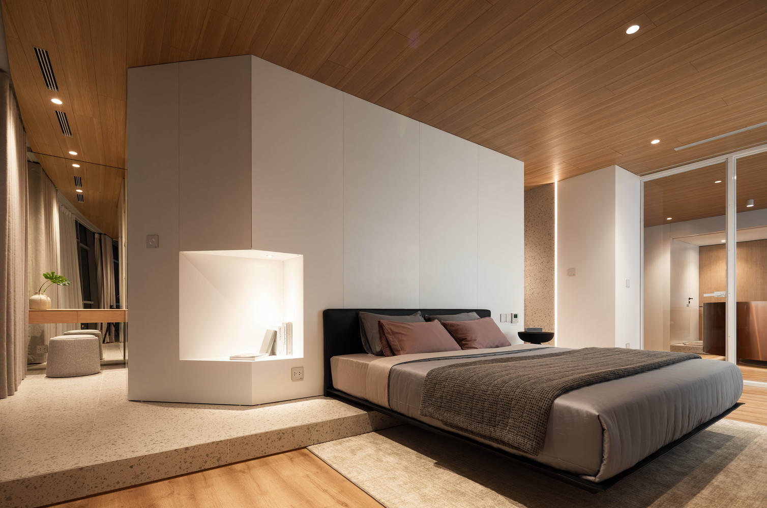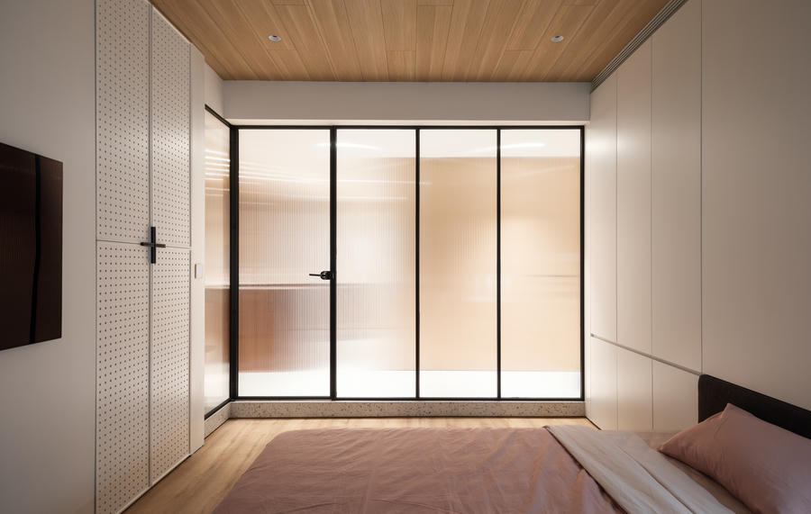 Phần tốt nhất của tổng thể và phòng ngủ là sử dụng kính mờ làm vách ngăn phòng. Hiệu ứng không gian mang lại tầm nhìn vô tận từ Đông sang Tây và giữ cho các thành viên trong gia đình luôn được kết nối.