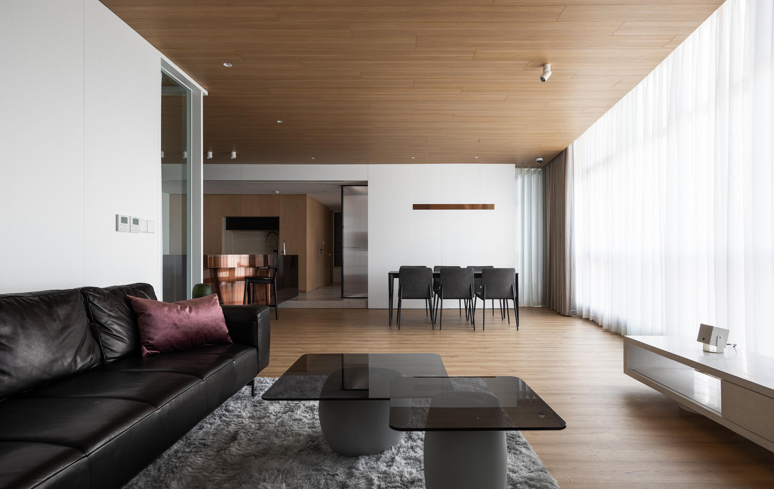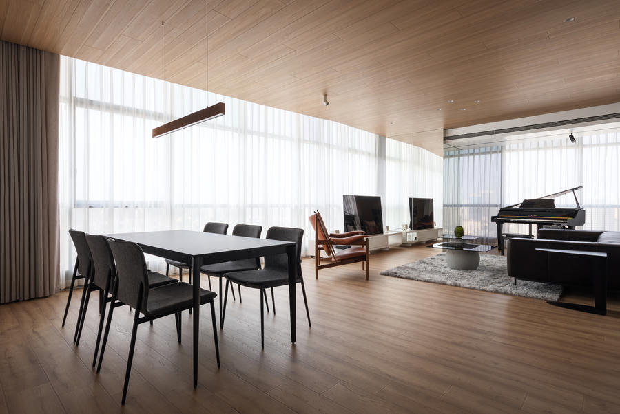 Mặt tiền của căn hộ được làm từ kính nên có tầm nhìn rộng và tràn ngập ánh sáng tự nhiên. Yêu âm nhạc, chủ nhân căn hộ muốn có một không gian giải trí để thưởng thức âm thanh và rượu vang.