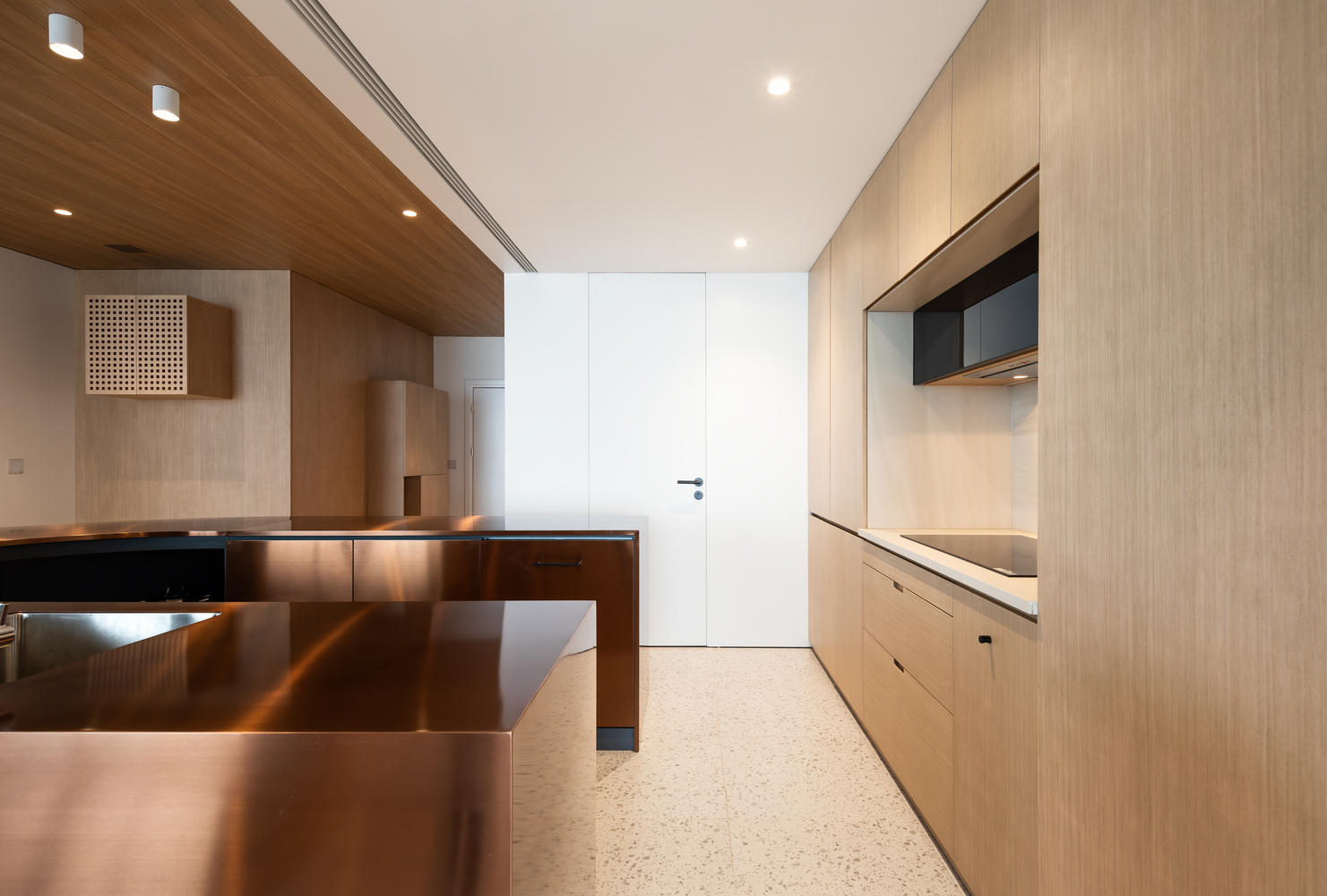 Lối vào chính của căn hộ được chắn bởi quầy bar cũng là đảo bếp. Các kiến trúc sư muốn dẫn mọi người từ từ vào các không gian chứ không phải trực tiếp, gợi sự tò mò rồi bùng nổ.