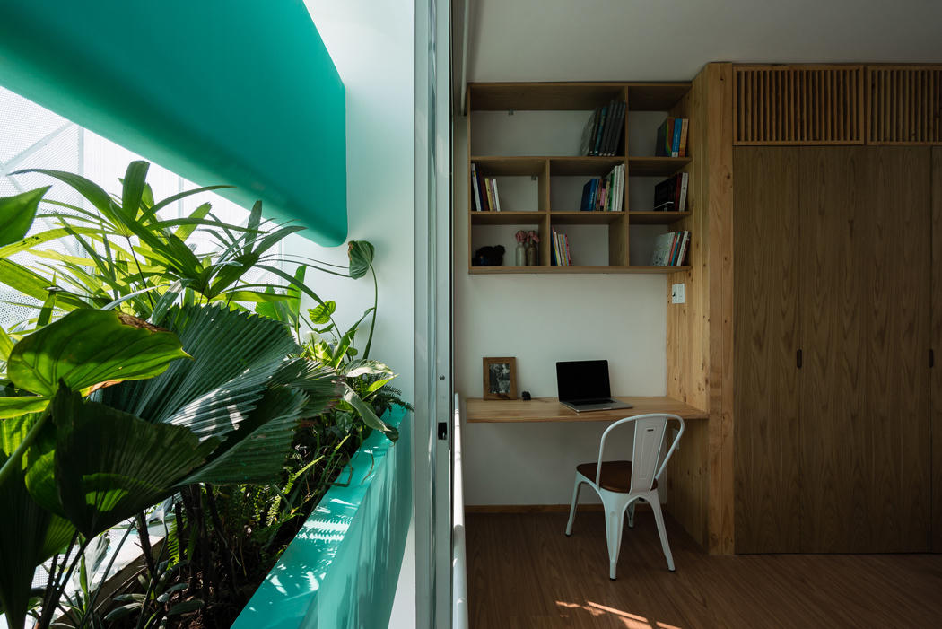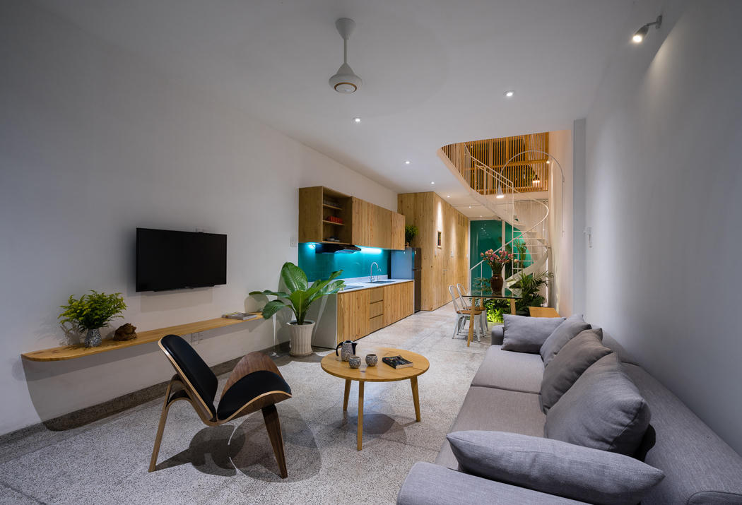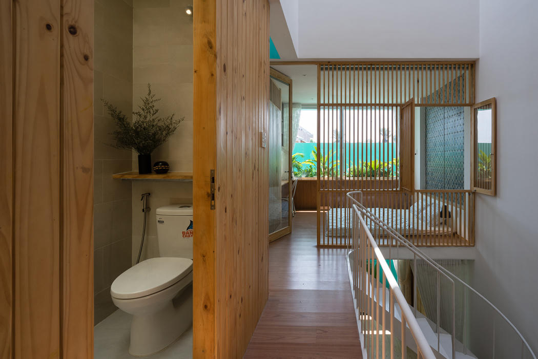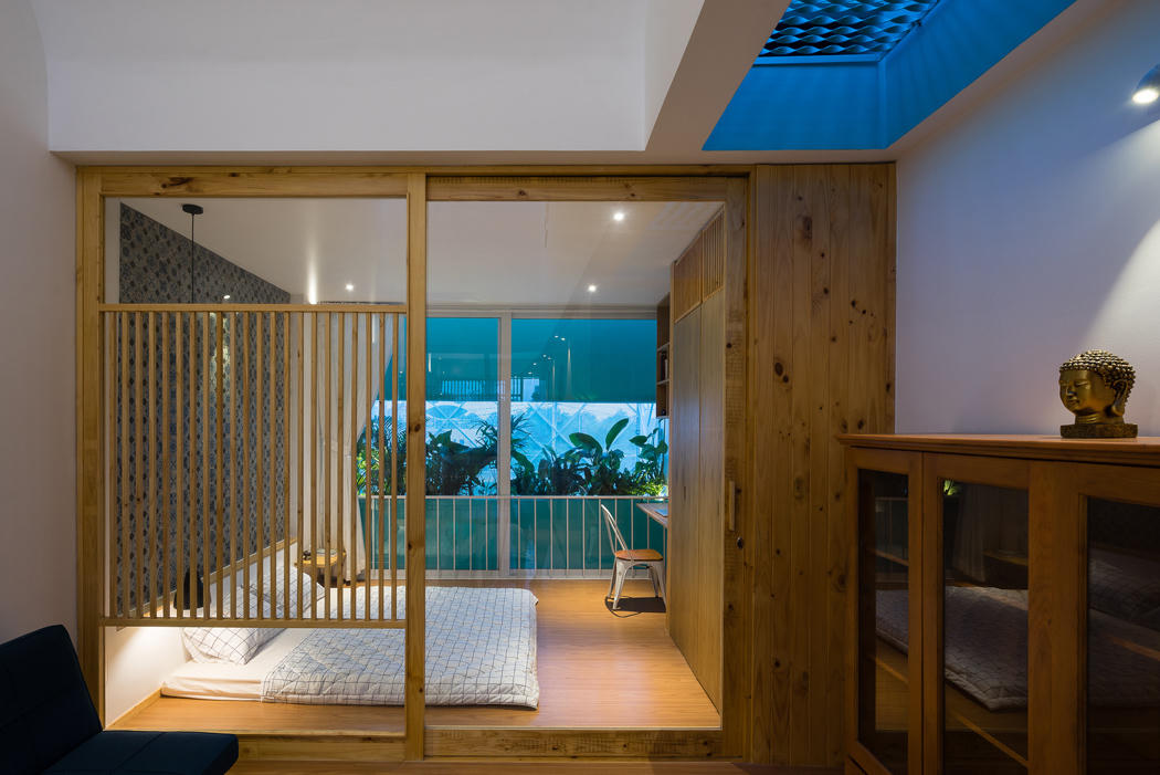 Hệ thống vách ngăn được thiết kế có thể di chuyển linh hoạt, mọi giới hạn cố hữu bị loại bỏ. Khu vườn đan xen xuất hiện và biến mất, nhà vệ sinh ẩn trong tủ gỗ... tạo cảm giác rộng rãi.