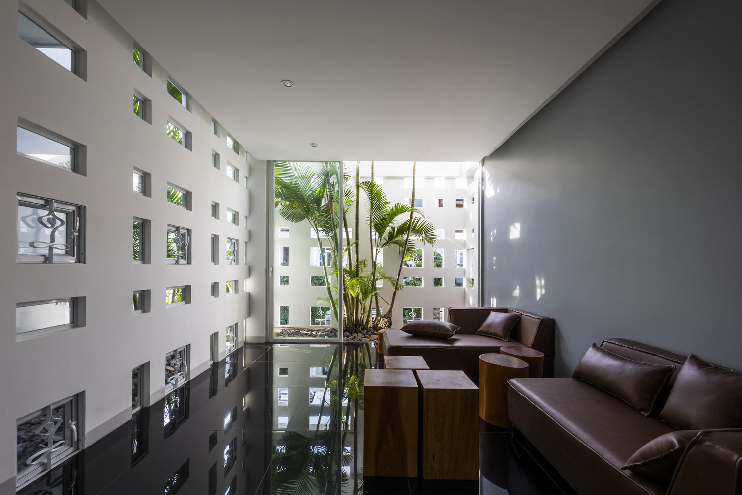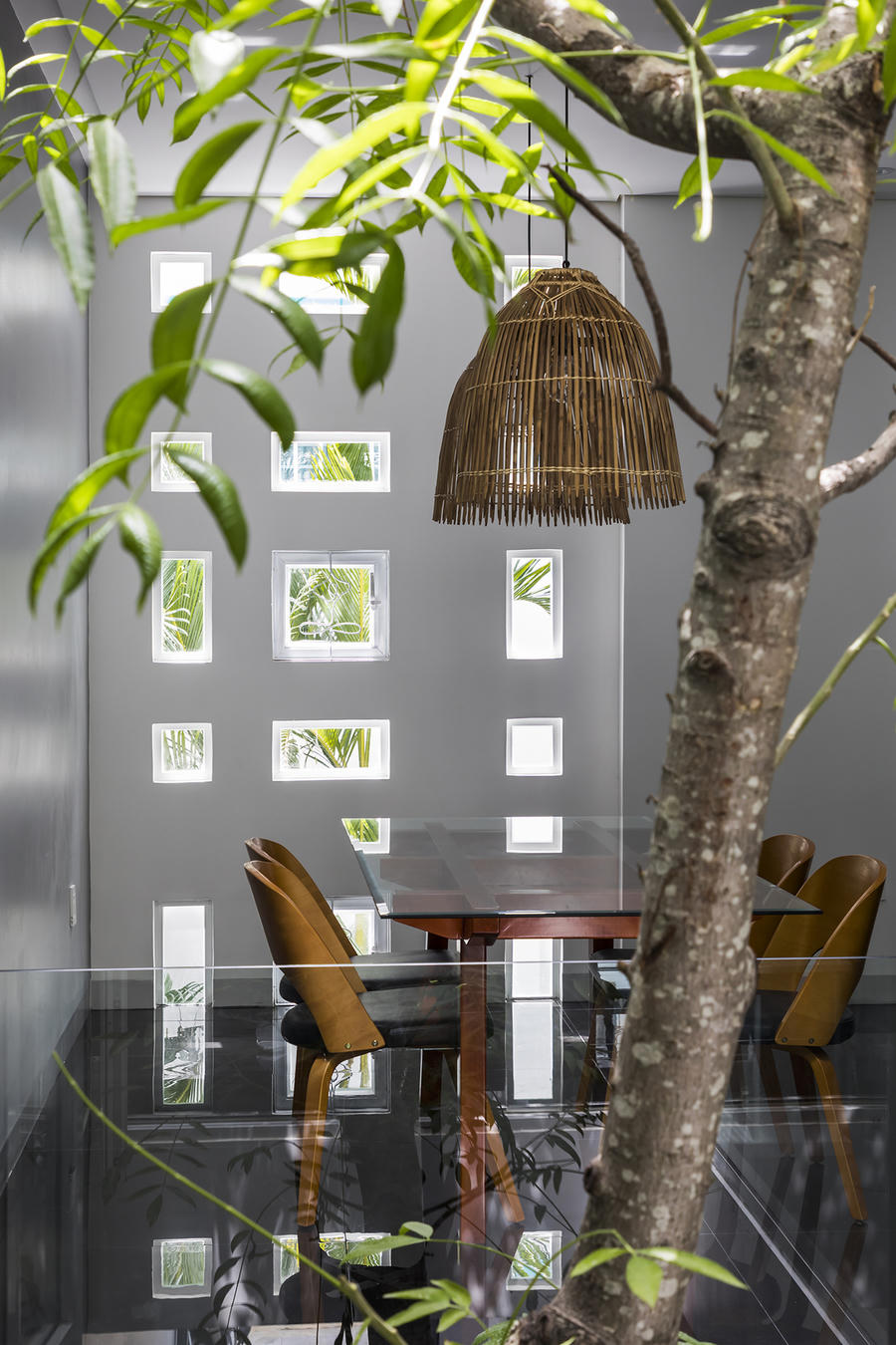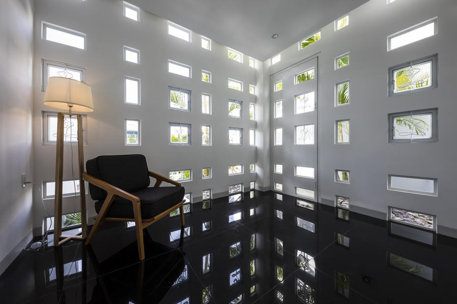 Những ô cửa sổ nhỏ nằm rải rác khắp bức tường, kết hợp giếng trời ở giữa nhà giúp ánh nắng đi vào nhà được giảm bớt nhiệt nhưng vẫn đảm bảo đủ sáng.