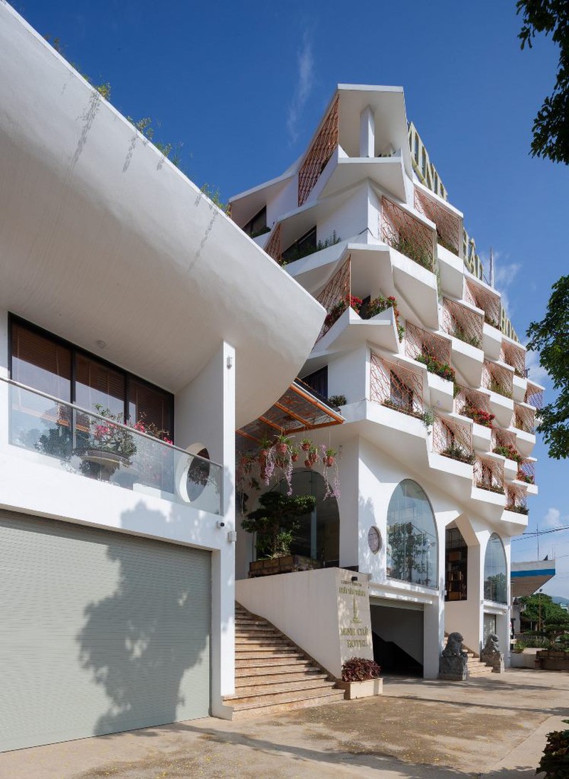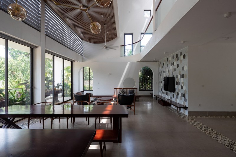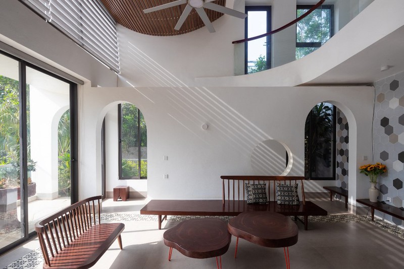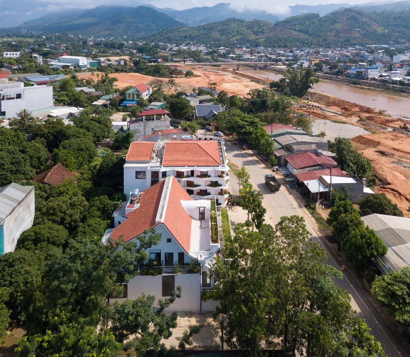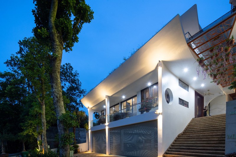 Nằm trên sườn đồi núi, phía trước nhìn ra sông Mã, ngôi nhà 3 tầng với kiến trúc mái này là tổ ấm của một gia đình ba thế hệ. Điểm độc đáo của căn nhà là phần mái nửa cong nửa vát, vừa giúp tăng gió tự nhiên cho không gian quanh năm mát mẻ, lại là nơi trồng cây tăng thêm mảng xanh cho công trình. Với bề mặt dốc, đội ngũ kiến trúc sư đã thiết kế tầng một được sử dụng làm nhà để xe, tầng hai có hai phòng ngủ cho bé trai và cháu, phòng khách và nhà bếp. Tầng ba bao gồm phòng ngủ chính của chủ nhà, khu vực giặt ủi, phòng thờ và cầu thang cong dẫn lên mái nhà.Ngôi nhà này có bốn mặt nhìn ra sân hoặc khu vườn nhỏ. Phần mái uốn cong với phần thiết kế bồn thông minh vừa giúp thông gió, tạo độ mềm mại không gian, đồng thời là nơi để gia chủ trồng thêm cây, tăng thêm sắc xanh cho tổ ấm.Thiết kế mái vát tạo hình chữ A, tách rời ở đỉnh giúp ánh nắng chiếu xuống không gian phòng khách bên dưới vừa đủ sáng lại không bị quá nóng. Thiết kế lệch tầng giúp các không gian chức năng bên trong có thể thông gió một cách tự nhiên. Cùng với đó, ánh sáng từ các khung cửa kính mang đến cho ngôi nhà sự thông thoáng và kết nối với thiên nhiên bên ngoài.Để tăng sự kết nối giữa các không gian, giới kiến trúc sư đã thiết kế nối liền phòng khách với khu vực ăn uống. Ngồi ở bất kỳ góc nhỏ nào cũng có thể hướng tầm nhìn ra bên ngoài, ngắm nhìn khung cảnh thiên nhiên lãng mạn, hóng nắng hóng gió một cách thoải mái.Kiến trúc sư chủ yếu sử dụng gam màu gỗ và màu trắng cho ngôi nhà, đồng thời điểm tô thêm nhiều vách tường có những ô gạch khác loại nhằm tăng thêm sự thu hút.Hệ lam gỗ trên lớp cửa chính đảm bảo thông gió và thoáng khí trong nhà.Công trình với sự tổng hòa giữa cây xanh, sự thông gió, ánh sáng đã mang đến một cuộc sống thoải mái nhất cho mọi người trong gia đình.