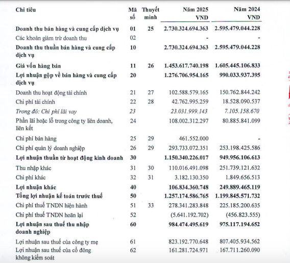 Năm vừa qua, công ty ghi nhận 2.730 tỷ đồng doanh thu thuần hợp nhất, lợi nhuận trước thuế đạt 1.257 tỷ đồng, đồng loạt tăng 5% so với năm 2024.