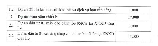 Cảng Nghệ Tĩnh lên kế hoạch đầu tư 2025 với tổng số tiền 26,5 tỷ đồng. Trong đó, 9,5 tỷ đồng dành cho dự án xây dựng cơ bản (nâng cấp mặt cầu, bãi chứa hàng, đường nội bộ Cảng Cửa Lò) và 17 tỷ đồng cho dự án mua sắm thiết bị (máy đào bánh lốp, xe nâng chụp container).