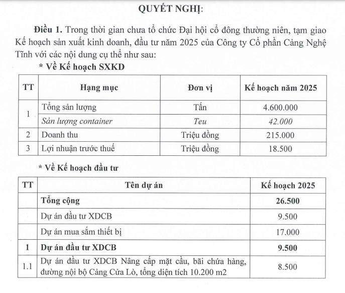 Hội đồng quản trị Công ty cổ phần Cảng Nghệ Tĩnh (mã ck: NAP) mới ra quyết nghị về kế hoạch sản xuất kinh doanh, đầu tư năm 2025.