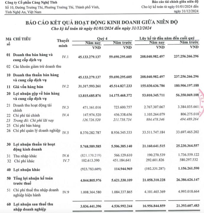 Về kết quả kinh doanh, Cảng Nghệ Tĩnh ghi nhận doanh thu thuần ghi nhận doanh thu thuần 45,1 tỷ đồng trong quý IV/2024, giảm 24,3% so với cùng kỳ. Lợi nhuận sau thuế đạt 3,8 tỷ đồng, giảm 16% so với con số 4,5 tỷ đồng ở quý IV/2023. Nguyên nhân sụt giảm do sản lượng hàng thông quan cảng giảm, trong khi chi phí nhiên liệu, sửa chữa và chi phí phân bổ tăng mạnh.
