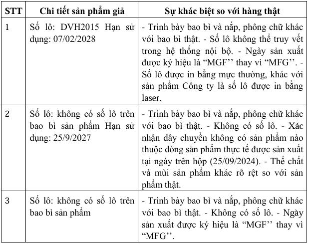 Theo nội dung thông báo, sản phẩm giả có bao bì, nhãn mác tương tự sản phẩm chính hãng, dễ gây nhầm lẫn cho người tiêu dùng. Văn bản của Cục Quản lý Dược cũng cung cấp thông tin nhận diện và dấu hiệu phân biệt sản phẩm thật - giả để người dân có thể nhận biết.