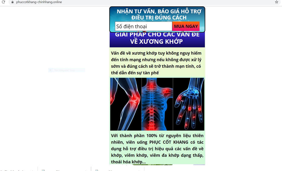 Theo Cục An toàn thực phẩm, trong thời gian vừa qua trên website: https://www.phuccotkhang-chinhhang.online/ có nội dung quảng cáo sản phẩm Thực phẩm bảo vệ sức khỏe Phục Cốt Khang quảng cáo thực phẩm gây hiểu nhầm có tác dụng như thuốc chữa bệnh, quảng cáo sử dụng hình ảnh bác sỹ, cảm ơn của bệnh nhân để quảng cáo thực phẩm, lừa dối người tiêu dùng, vi phạm quy định pháp luật về quảng cáo.
