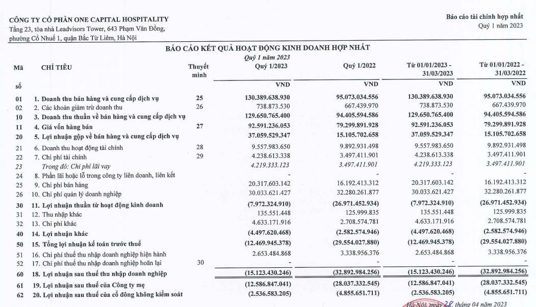 Mặc dù không công bố con số chi tiết Kem Tràng Tiền đóng góp bao nhiêu nhưng báo cáo tài chính quý I/2023 của OCH mới đây ghi nhận doanh thu thuần đạt 129,6 tỷ đồng, tăng 37% so với cùng kỳ năm trước. Giá vốn hàng hóa tăng, chi phí tài chính tăng tác động khiến công ty ghi nhận khoản lỗ sau thuế là 15 tỷ đồng.