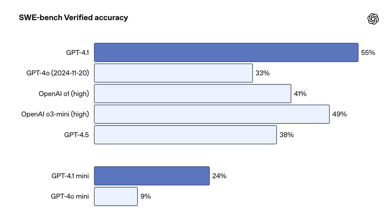 Về hiệu suất, OpenAI cho biết mô hình GPT-4.1 đầy đủ vượt trội hơn các mô hình GPT-4o và GPT-4o mini trên các tiêu chuẩn lập trình, bao gồm SWE-bench. Tuy nhiên, theo kiểm tra nội bộ của OpenAI, GPT-4.1 đạt điểm từ 52% đến 54,6% trên SWE-bench Verified, thấp hơn một chút so với Gemini 2.5 Pro của Google (63,8%) và Claude 3.7 Sonnet của Anthropic (62,3%) trên cùng một tiêu chuẩn.