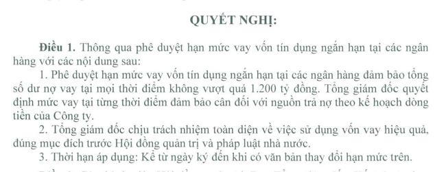 Theo Nghị quyết, Tổng Giám đốc Công ty sẽ được quyền quyết định mức vay tại từng thời điểm, đảm bảo cân đối với nguồn trả nợ theo kế hoạch dòng tiền của Công ty. Đồng thời, Tổng Giám đốc cũng chịu trách nhiệm toàn diện về việc sử dụng vốn vay hiệu quả, đúng mục đích.