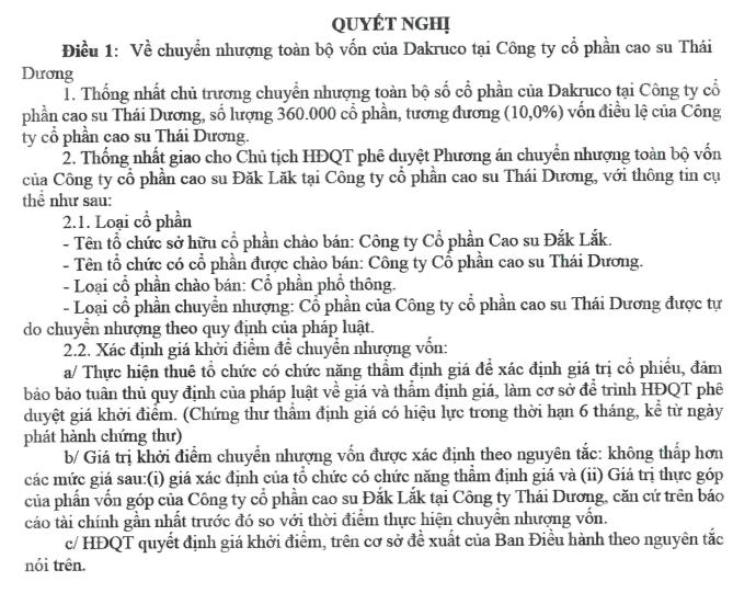 Công ty cổ phần Cao su Đắk Lắk (Dakruco, mã ck: DRG) vừa ra quyết nghị thông qua việc chuyển nhượng toàn bộ 360.000 cổ phiếu của Công ty cổ phần Cao su Thái Dương, tương ứng 10% vốn điều lệ.