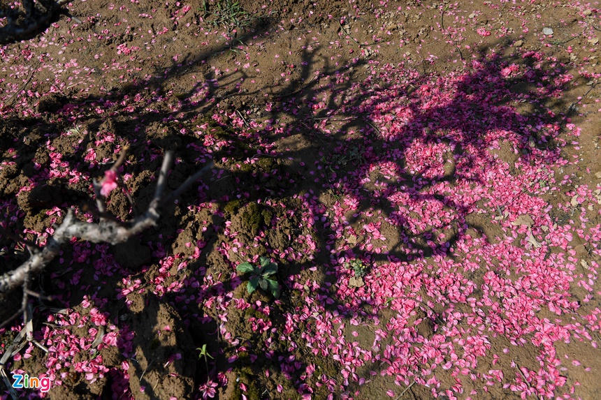 Với những cây đào không bán được, chủ vườn phải cắt cành để dưỡng cho mùa sau. Những cánh hoa rụng đầy dưới gốc.