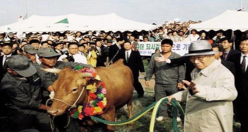 Đó là một trong 1.001 con bò được Chung Ju Yung tặng nông dân làng Asan - nơi ông sinh ra và lớn lên. Một trong những dự án chính của Ju Yung trong chuyến đi trên là thương nghị với Chính phủ Bình Nhưỡng về công trình khu du lịch tại núi Keumgang thuộc địa phận của Triều Tiên. Tuy nhiên, vào ngày 21/3/2001, Chung Ju Yung đã mất trước khi toàn bộ công trình hoàn thành...