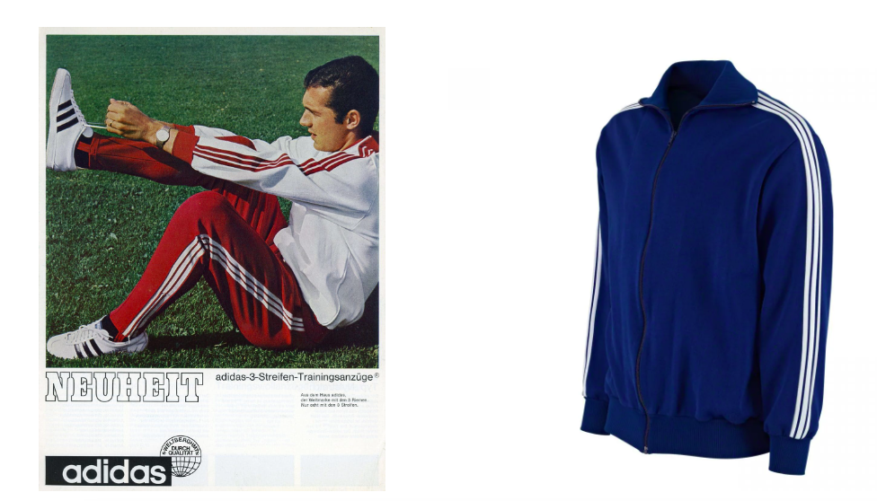 Bộ đồ thể thao không phải là một khái niệm mới đối với các vận động viên, nhưng vào năm 1967, Adidas đã phát hành một bộ đồ làm bằng sợi tổng hợp nhẹ mới và có chi tiết thời trang sành điệu 3 vạch kẻ được vay mượn từ giày Adidas và được trang trí dọc theo cánh tay và chân.