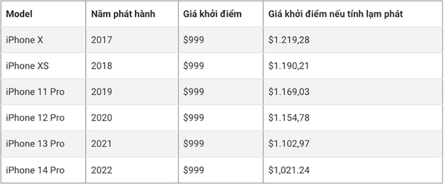 iPhone X được ra mắt vào năm 2017 với giá khởi điểm là 999 USD. Năm năm sau, iPhone 14 Pro ra mắt với mức giá tương tự như vậy. Nếu bạn tính đến lạm phát, con số phải bỏ ra cho iPhone 14 Pro lẽ ra phải khoảng 1.200 USD, tuy nhiên, bằng cách nào đó, mức giá vẫn giữ nguyên.