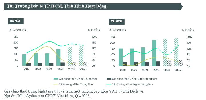 Theo CBRE Việt Nam, nhờ vào nguồn cầu ổn định và nguồn cung mới hạn chế, thị trường bất động sản bán lẻ tại Hà Nội và TP HCM tiếp tục ghi nhận mức tăng trưởng tốt về giá thuê.