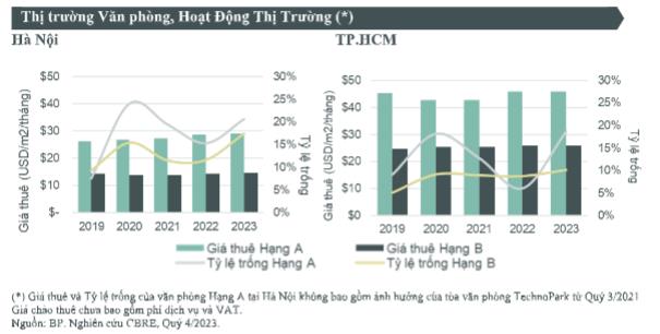 Tại Hà Nội, tỷ lệ văn phòng trống của các dự án hạng A và hạng B lần lượt là 20,7% và 17,5%, tăng 5,3 điểm phần trăm và 5,8 điểm phần trăm so với năm trước. Tương tự, tại TP.HCM, tỷ lệ văn phòng trống của các dự án hạng A và hạng B là 18,6% và 10,1%, tăng lần lượt 12,5 điểm phần trăm và 1,4 điểm phần trăm so với năm trước.
