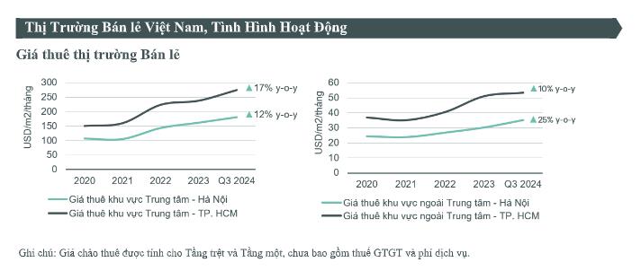Giá thuê của khu vực trung tâm hầu như không đổi do không còn diện tích trống để cho thuê, trung bình tầng trệt và tầng một đạt 274 USD/m2. Giá thuê khu vực ngoài trung tâm trung bình ghi nhận 53 USD/m2, giảm 0,9% so với quý trước vì các trung tâm thương mại mở mới đều nằm ở các quận ven nên có giá chào thuê mềm hơn mặt bằng chung, nhưng vẫn cao hơn 10% so với cùng kỳ năm trước.
