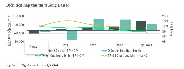 Riêng trong 9 tháng 2024, mặt bằng bán lẻ cho thuê mới ghi nhận là 87.000 m2, cao nhất trong 3 năm gần đây. Mặt bằng các trung tâm thương mại mở mới đều được lấp đầy gần như 100%, dẫn đến tỷ lệ trống trung bình toàn thị trường ở cả khu vực trung tâm và ngoài trung tâm xấp xỉ bằng nhau, chỉ ở mức 5-6%.