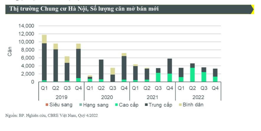 Trong năm 2023, CBRE cũng dự báo mức độ mở bán mới có thể giảm nhẹ hoặc tương đương mức mở bán của 2022, đạt khoảng 14.000 - 16.000 căn.