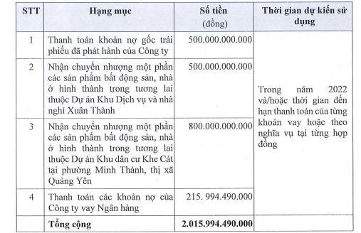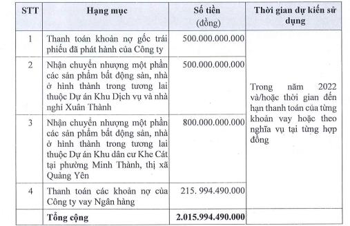 Tổng số tiền thu được hơn 2.000 tỷ đồng sẽ dùng 500 tỷ đồng thanh toán khoản npwj gốc trái phiếu đã phát hành của công ty; dùng 500 tỷ đồng nhận chuyển nhượng một phần các sản phẩm bất động sản, nhà ở hình thành trong tương lai thuộc dự án Khu du lịch dịch vụ nhà ở tại Xuân Thành; dùng 800 tỷ đồng nhận nhận chuyển nhượng một phần các sản phẩm bất động sản, nhà ở hình thành trong tương lai thuộc dự án Khu dân cư Khe Cát tại phường Minh Thành, thị xã Quảng Yên. Số còn lại gần 216 tỷ đồng để thanh toán các khoản vay nợ ngân hàng.