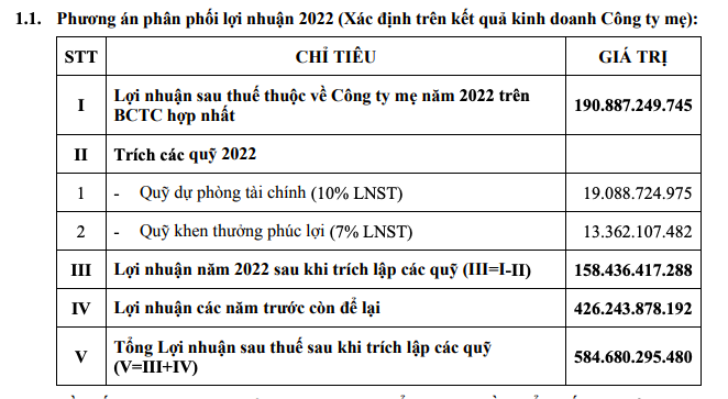 Cụ thể, lợi nhuận sau thuế thuộc về công ty mẹ năm 2022 trên báo cáo tài chính hợp nhất ghi nhận gần 191 tỷ đồng, doanh nghiệp dự kiến trích 10% cho quỹ dự phòng tài chính và 7% cho quỹ khen thưởng phúc lợi. Tổng lợi nhuận sau thuế sau khi trích lập các quỹ cộng với phần lợi nhuận các năm trước còn để lại gần 585 tỷ đồng.