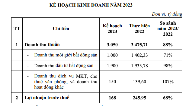 Năm 2023, CRE dự kiến doanh thu thuần đạt 3.050 tỷ đồng, giảm 12%. Lợi nhuận trước thuế đạt 168 tỷ đồng, giảm 32% so với kết quả thực hiện được trong năm 2022.