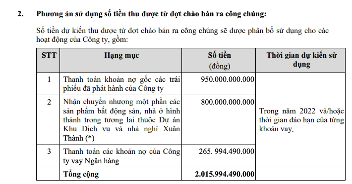 Với số tiền dự kiến huy động được là gần 2.016 tỷ đồng, doanh nghiệp dự định dùng 950 tỷ đồng để thanh toán khoản nợ gốc các trái phiếu đã phát hành; 800 tỷ đồng để nhận chuyển nhượng một phần các sản phẩm bất động sản, nhà ở hình thành trong tương lai thuộc dự án khu dịch vụ và nhà nghỉ Xuân Thành. Gần 266 tỷ đồng còn lại dùng để thanh toán các khoản nợ vay ngân hàng.