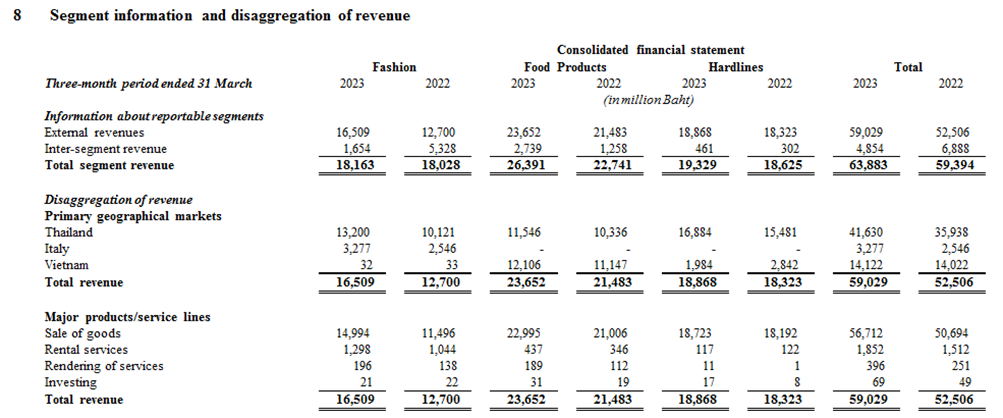 Phân tích cơ cấu doanh thu theo khu vực thị trường thì hiện nay đứng đầu bảng tỷ lệ đóng góp là Thái lan với 41.6 tỷ Bath, tương đương 28.400 tỷ đồng chiếm hơn 70,5% doanh số. Doanh thu tại Việt Nam đang ghi nhận là 14 tỷ Bath, tương đương gần 9.600 tỷ đồng, đóng góp gần 24% trong tổng doanh thu. Và cuối cùng là Italy với hơn 3,2 tỷ bath đóng góp 5,5% trong tổng doanh số.