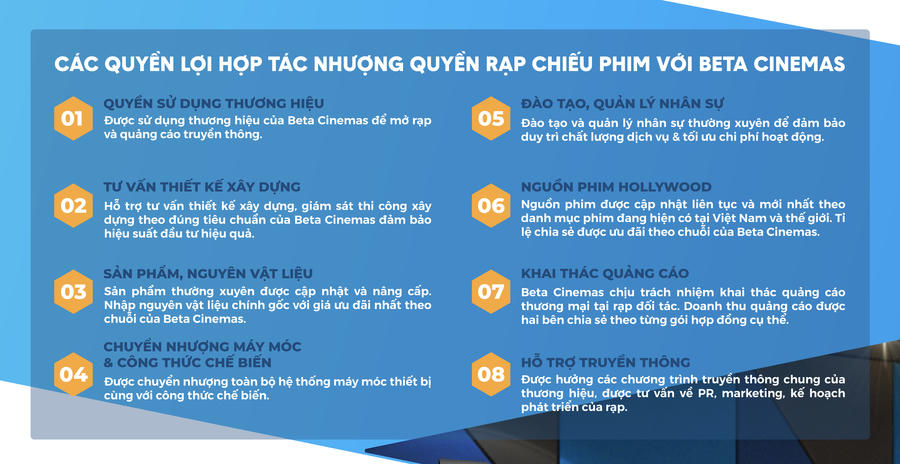 Với kinh nghiệm đi đầu trong lĩnh vực nhượng quyền thương hiệu rạp chiếu film, cùng đội ngũ quản lý trẻ trung năng động giàu kinh nghiệm và hỗ trợ tối đa các quyền lợi hợp tác, Beta sẽ là sự lựa chọn tốt nhất của các nhà đầu tư muốn khai phá thị trường rạp chiếu phim đầy tiềm năng tại Việt Nam trong thời gian tới.