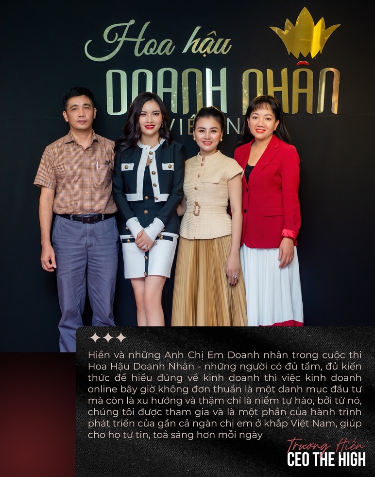 Gần đây, Hiền có dịp đồng hành cùng cuộc thi Hoa Hậu Doanh Nhân, và đã loạt vào vòng trong nhờ những cảm hứng xuất sắc của mình. Ở đó, Hiền và những Anh Chị Em Doanh nhân trong cuộc thi Hoa Hậu Doanh Nhân - những người có đủ tầm, đủ kiến thức để hiểu đúng về kinh doanh thì việc kinh doanh online bây giờ không đơn thuần là một danh mục đầu tư mà còn là xu hướng và thậm chí là niềm tự hào, bởi từ nó, chúng tôi được tham gia và là một phần của hành trình phát triển của gần cả ngàn chị em ở khắp Việt Nam, giúp cho họ tự tin, toả sáng hơn mỗi ngày.