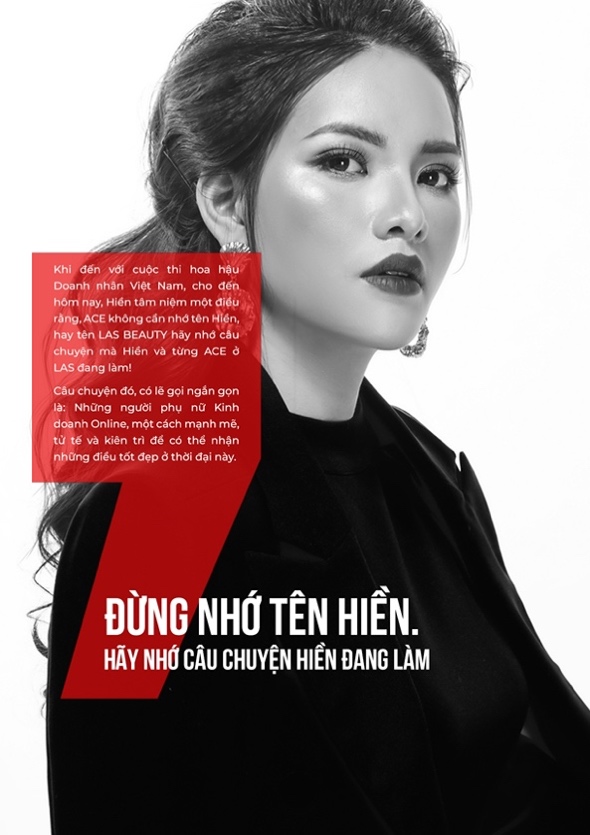 Khi đến với cuộc thi hoa hậu Doanh nhân Việt Nam, cho đến hôm nay, Hiền tâm niệm một điều rằng, mọi người không cần nhớ tên Hiền, hay tên The High, Las Beauty, thay vào đó, hãy nhớ câu chuyện mà Hiền và từng Anh Chị Em kinh doanh online đang làm!