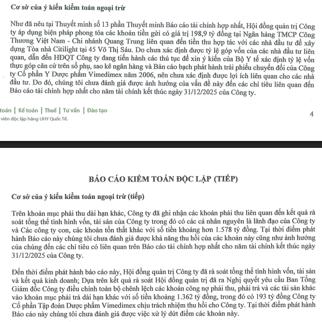 Tại thời điểm phát hành báo cáo hợp nhất kiểm toán năm 2025, Y Dược phẩm Vimedimex chưa đánh giá được khả năng thu hồi của các khoản này cũng như ảnh hưởng của chúng đến các chỉ tiêu có liên quan trên Báo cáo tài chính hợp nhất cho năm tài chính kết thúc ngày 31/12/2025 của công ty.