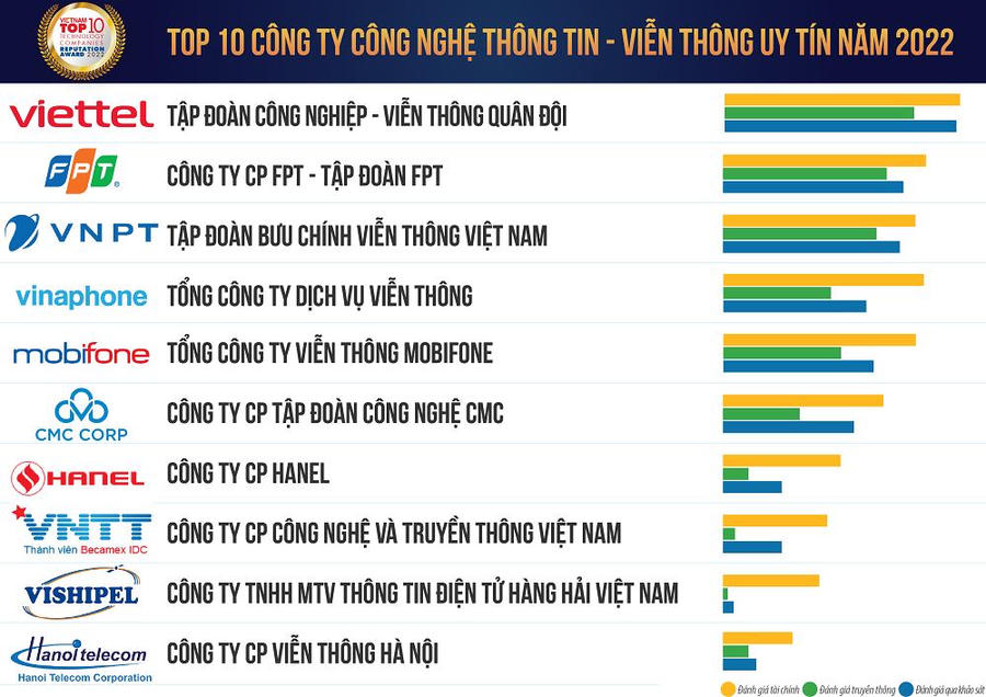 Cụ thể, năm 2022, FPT đứng thứ 2 trong danh sách Top 10 Công ty công nghệ thông tin - viễn thông uy tín năm 2022. Hai công ty thành viên của FPT gồm FPT Software và FPT IS đứng vị trí số 1 và số 3 trong danh sách Top 10 Công ty công nghệ cung cấp dịch vụ, giải pháp phần mềm và tích hợp hệ thống uy tín năm 2022.